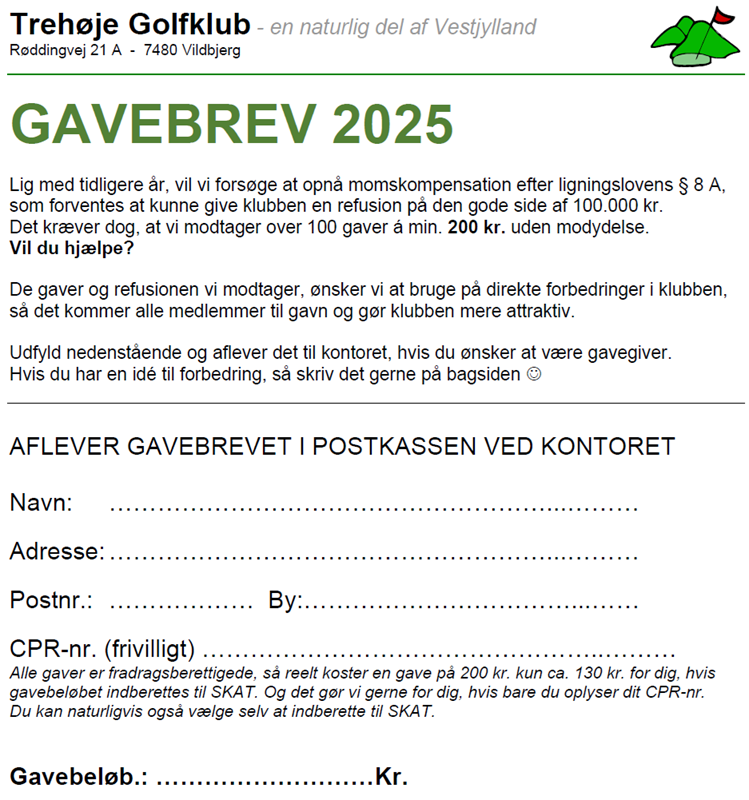 De gaver og refusionen vi modtager, ønsker vi at bruge på direkte forbedringer i klubben, så det kommer alle medlemmer til gavn og gør klubben mere attraktiv.